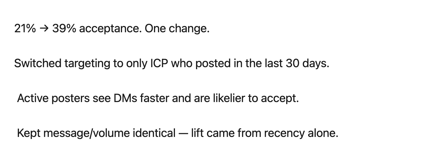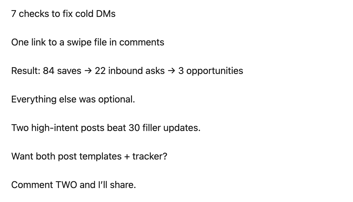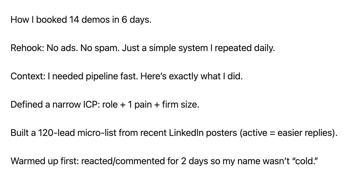 Hook: “I sent 92 DMs. 23 demos booked.”