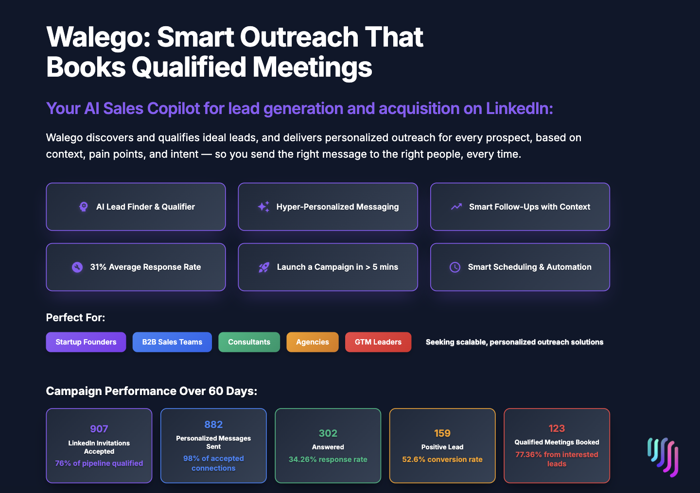 Meet Walego, an AI sales copilot that runs your LinkedIn prospecting end-to-end and books meetings while you sleep. In under five minutes, it builds a custom outreach strategy for your offer and ICP, then writes unique, context-aware messages for every qualified lead (value prop, pains, intent — no templates).