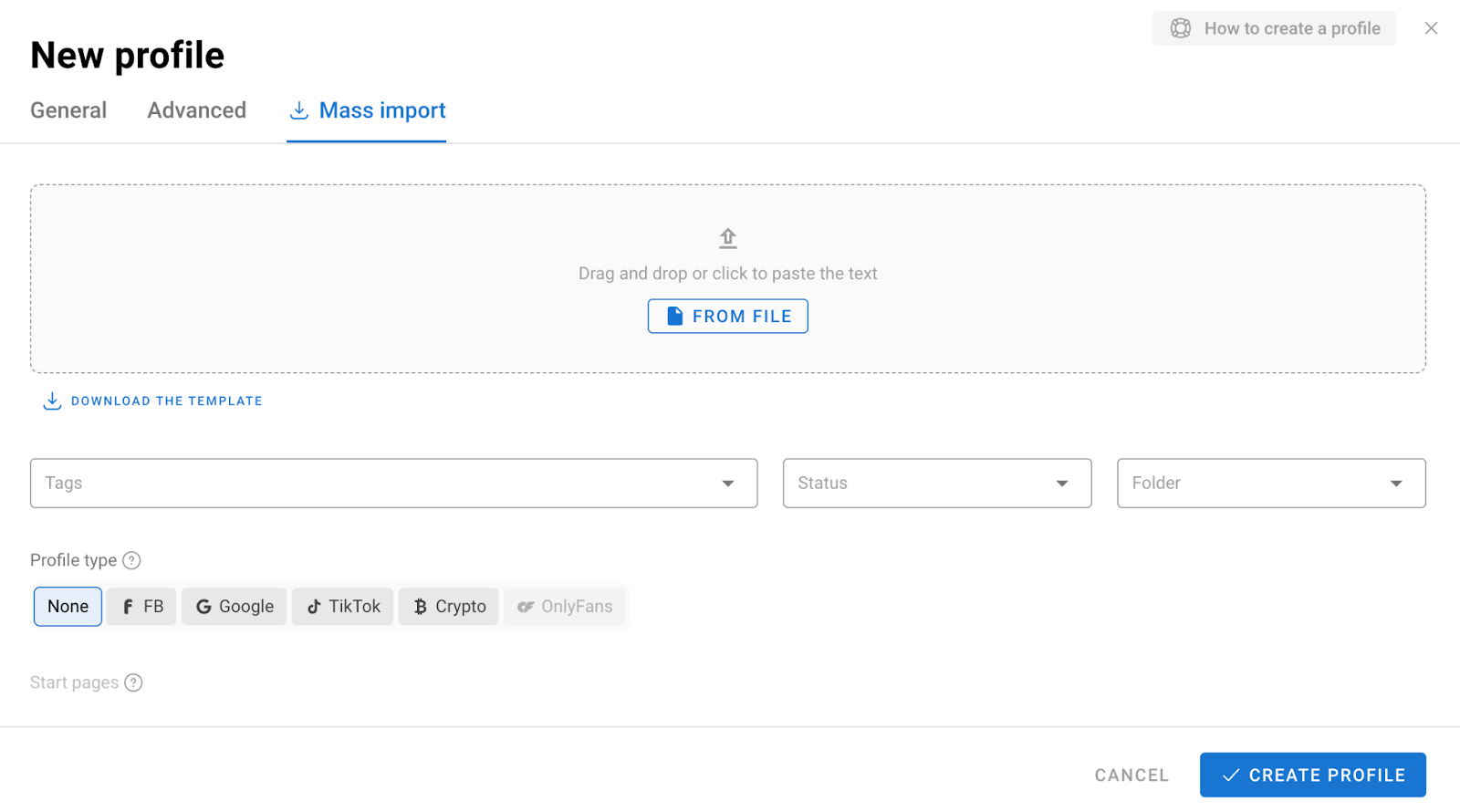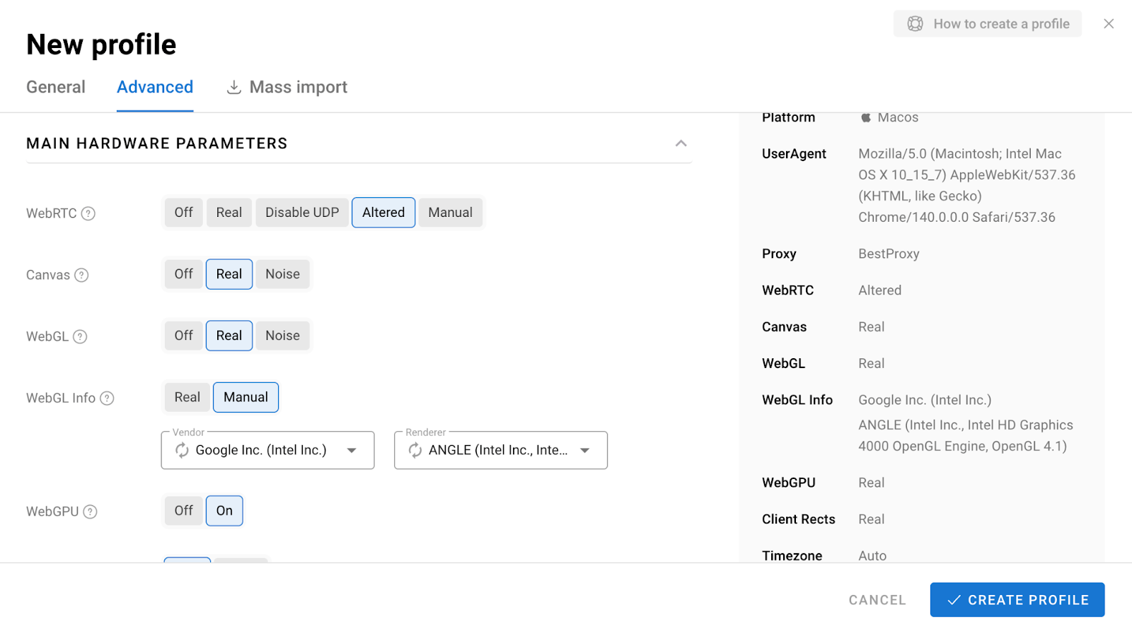 Creating a new browser profile in Dolphin Anti takes just several clicks. You only need to press “Create profile” in the upper corner, and you get a fresh environment with its own unique fingerprint. You can randomize parameters or adjust them manually.