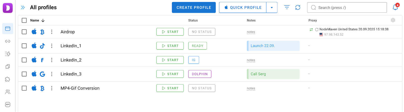Dolphin Anty is one of the most reliable solutions for managing multiple LinkedIn accounts from a single device. It is used to spoof the digital fingerprint across a wide range of parameters, including device type, OS, browser settings, fonts, timezone, WebRTC, and more. Each profile looks like a completely independent user, so LinkedIn cannot link them together. Even if one account is blocked, the others remain safe. What else is Dolphin Anty capable of?